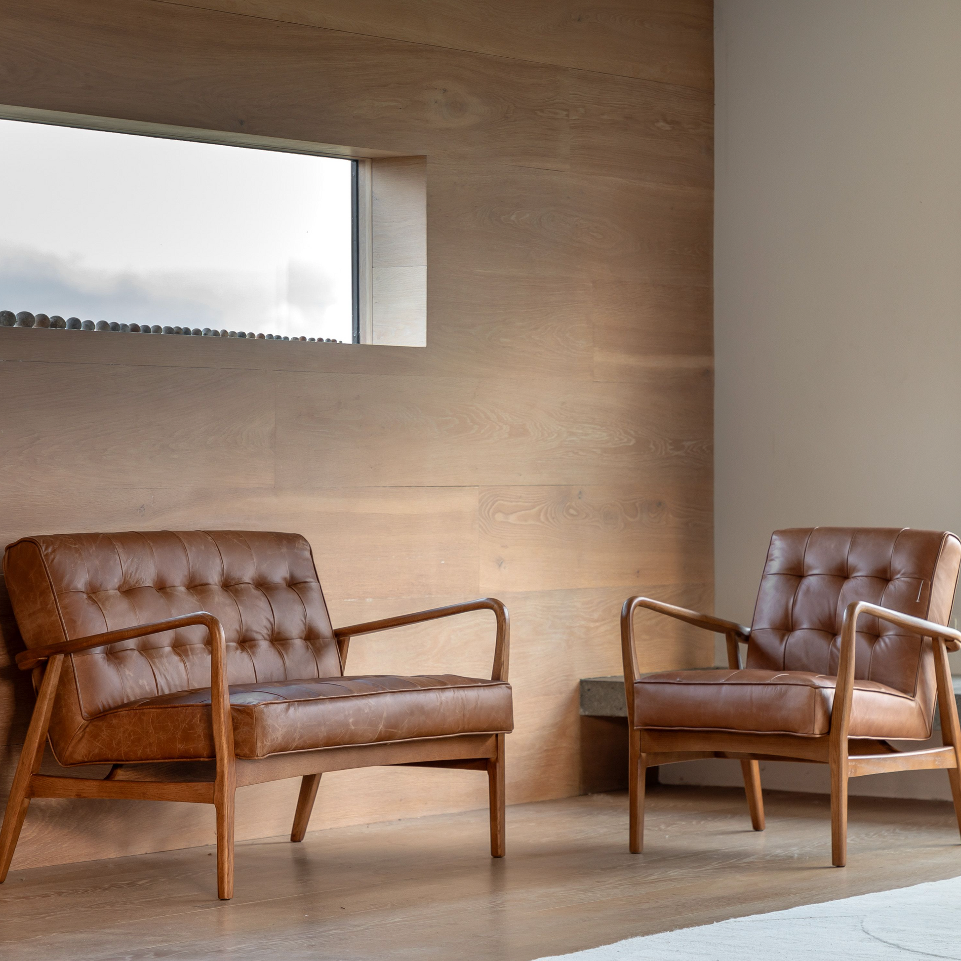 Mid century stand our piece with a solid oak angled frame twinned with top grain vintage brown leather and deep pull detailing. Dramatic retro design which is big on personality but small in its footprint. Style it with a floor lamp and small Travertine side table to maximise the look.
